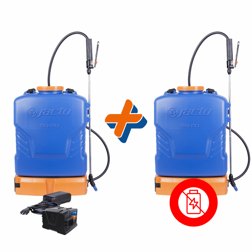 Combo contempla 01 pulverizador Jacto SB-20 completo (pulverizador + carregador + bateria) e 01 Jacto Sb-20 sem kit elétrico (sem bateria e carregador)